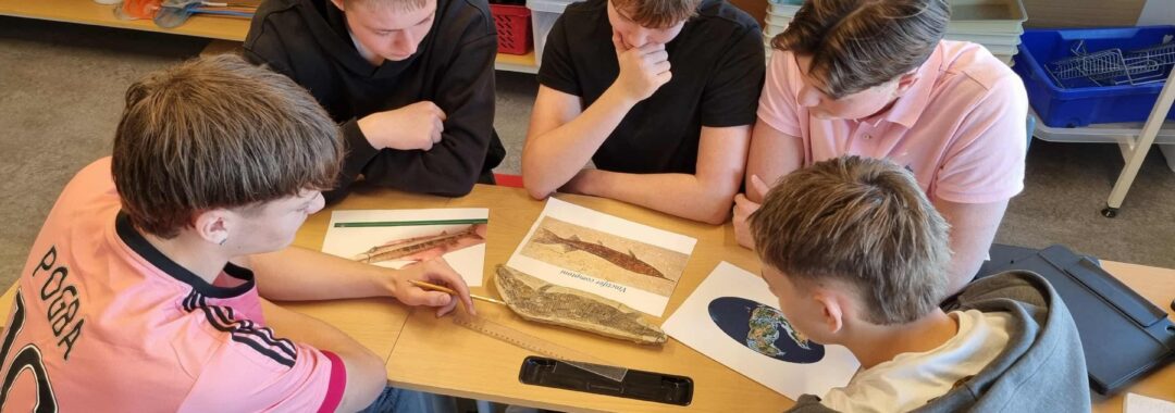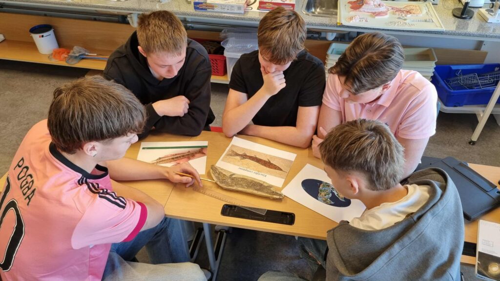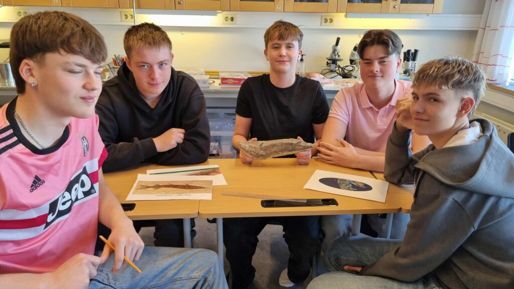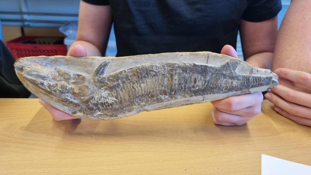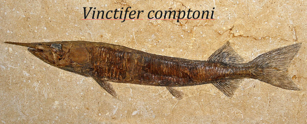 Guðmunda okkar á bókasafninu kom aldeilis færandi hendi í náttúrufræðistofuna í Snælandsskóla. Þar var um að ræða forláta steingerving af fiski. Eftir dálítið grúsk í heimildum erum við nokkuð viss um að hér sé um að ræða tegundina Vinctifer copmptoni sem er af flokki geislafiska. Þessi fiskur kom fram fyrir um 150 milljón árum (síðjúratímabilið) og hvarf svo aftur af yfirborði jarðar fyrir u.þ.b. 90 milljón árum (snemmkrítartímabilið) eða um ca. 70 milljón árum áður en Ísland byrjaði að myndast!. Þessir steingervingar eru nokkuð algengir í jarðlögum með Atlantshafsströnd S-Ameríku og alveg niður á Suðurskautslandið. Blómaskeið þessara fiska var á þeim tíma er Afríka og S-Ameríka tóku að skiljast að og S-Atlantshafið að myndast. Þessi góða gjöf er mikill fengur ekki síst fyrir 10. bekkinga sem um þessar mundir eru einmitt að fræðast um þróun lífsins og jarðsöguna.