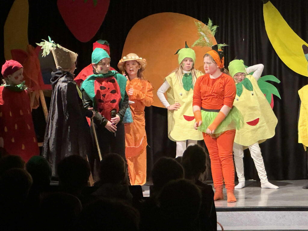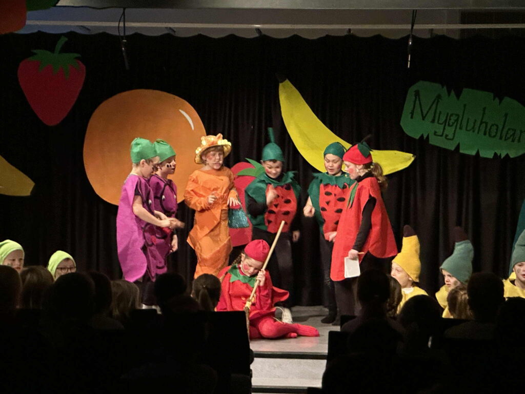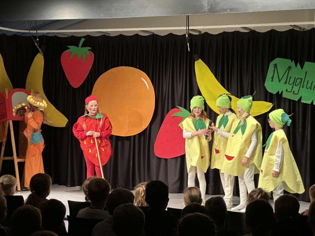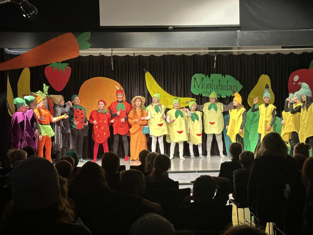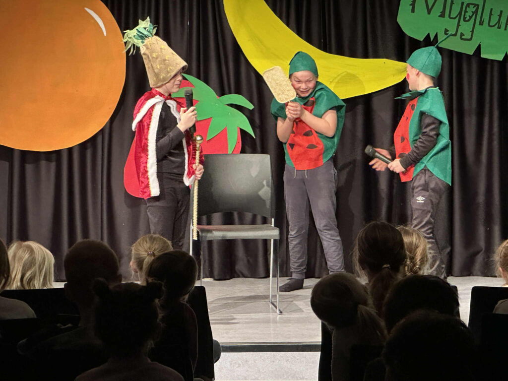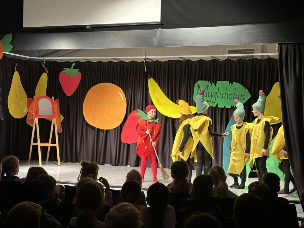 Nemendur í 4. bekk sýndu í vikunni söngleikinn Ávaxtakörfuna, sem fjallar um einelti og fordóma. Leikritið gerist í ávaxtakörfu þar sem allir ávextirnir eru kúgaðir af Imma ananas. Nemendur settu verkið upp með miklum metnaði og glæsibrag, og einkenndist sýningin af gleði og litadýrð.