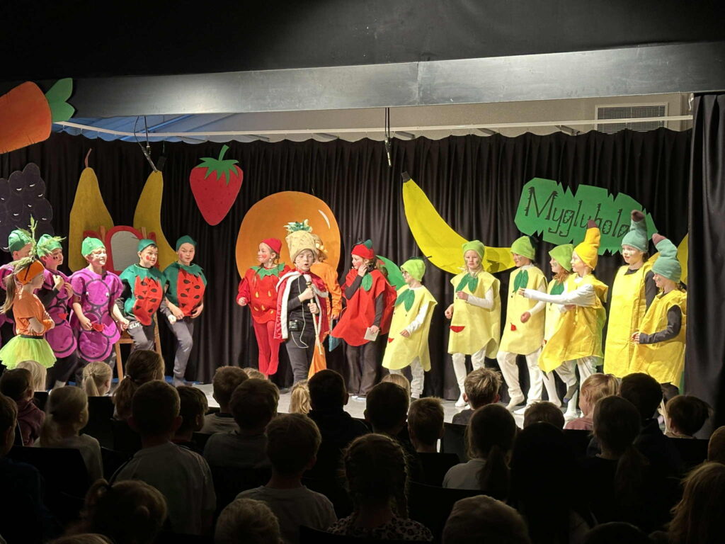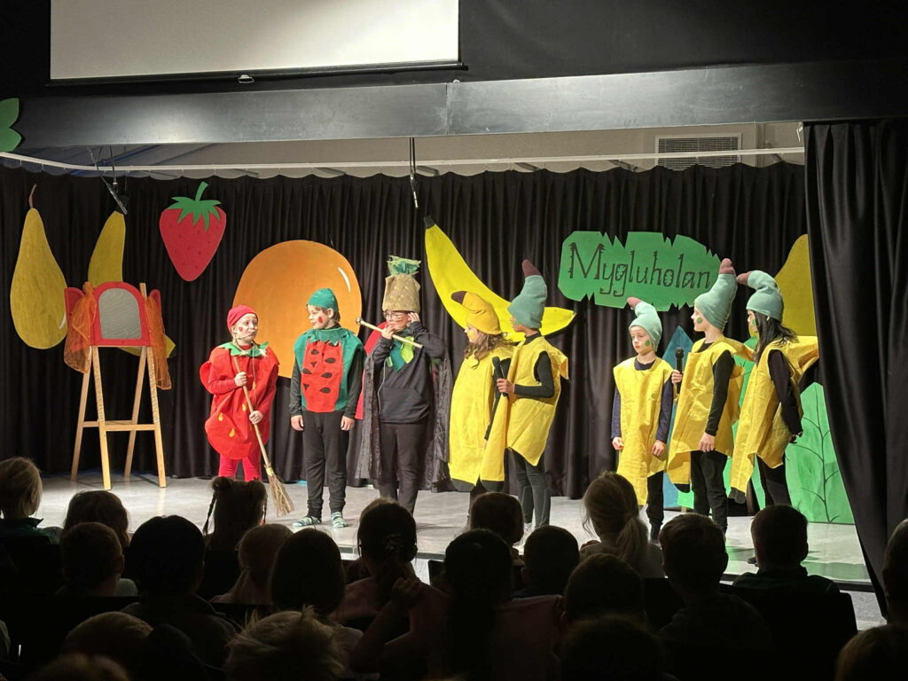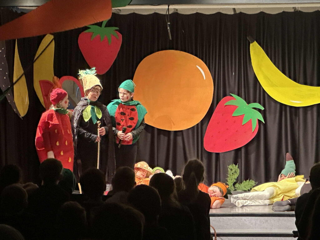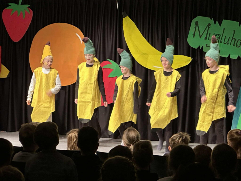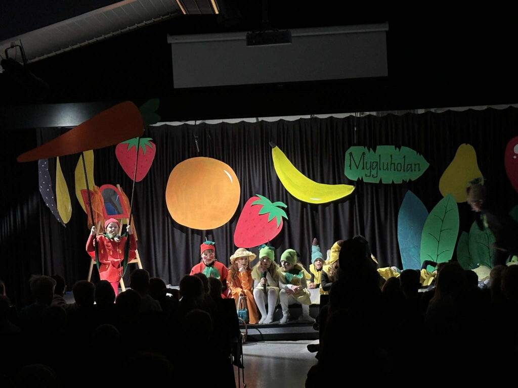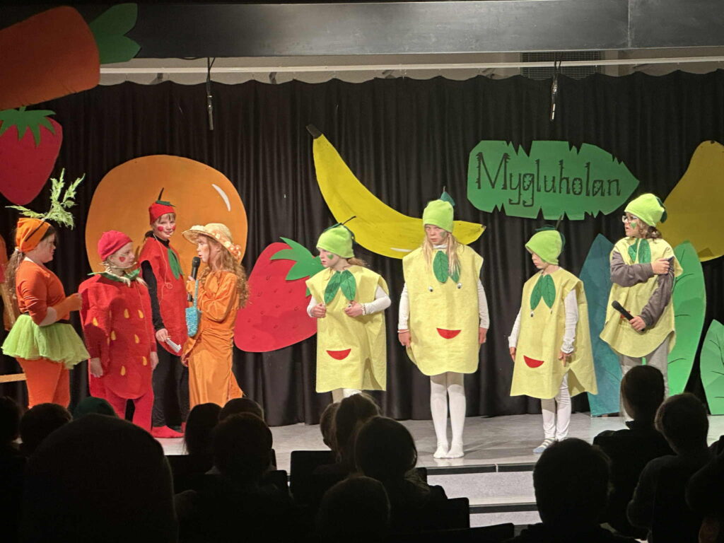 Nemendur í 4. bekk sýndu í vikunni söngleikinn Ávaxtakörfuna, sem fjallar um einelti og fordóma. Leikritið gerist í ávaxtakörfu þar sem allir ávextirnir eru kúgaðir af Imma ananas. Nemendur settu verkið upp með miklum metnaði og glæsibrag, og einkenndist sýningin af gleði og litadýrð.