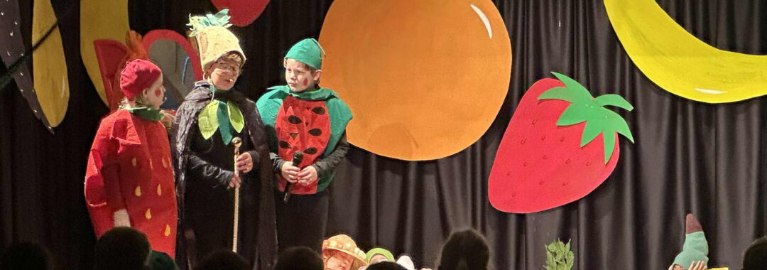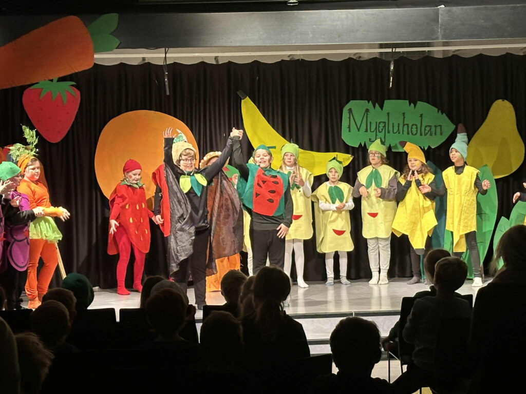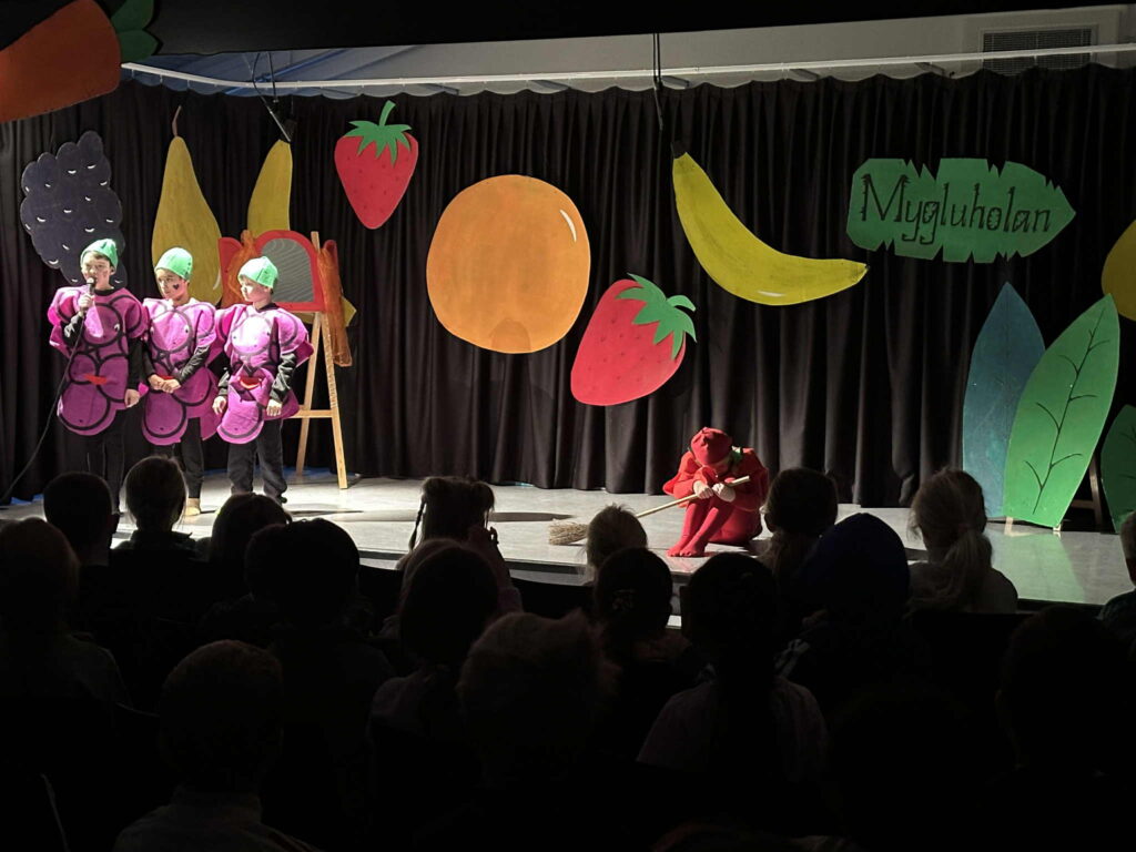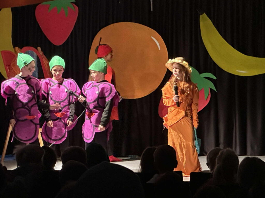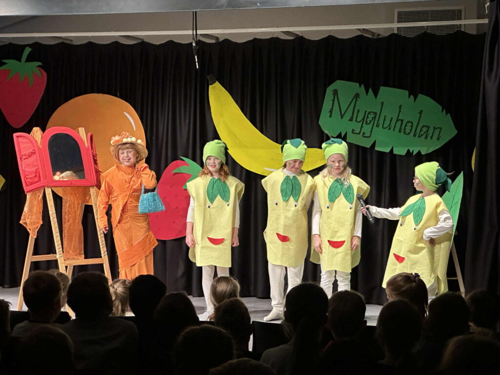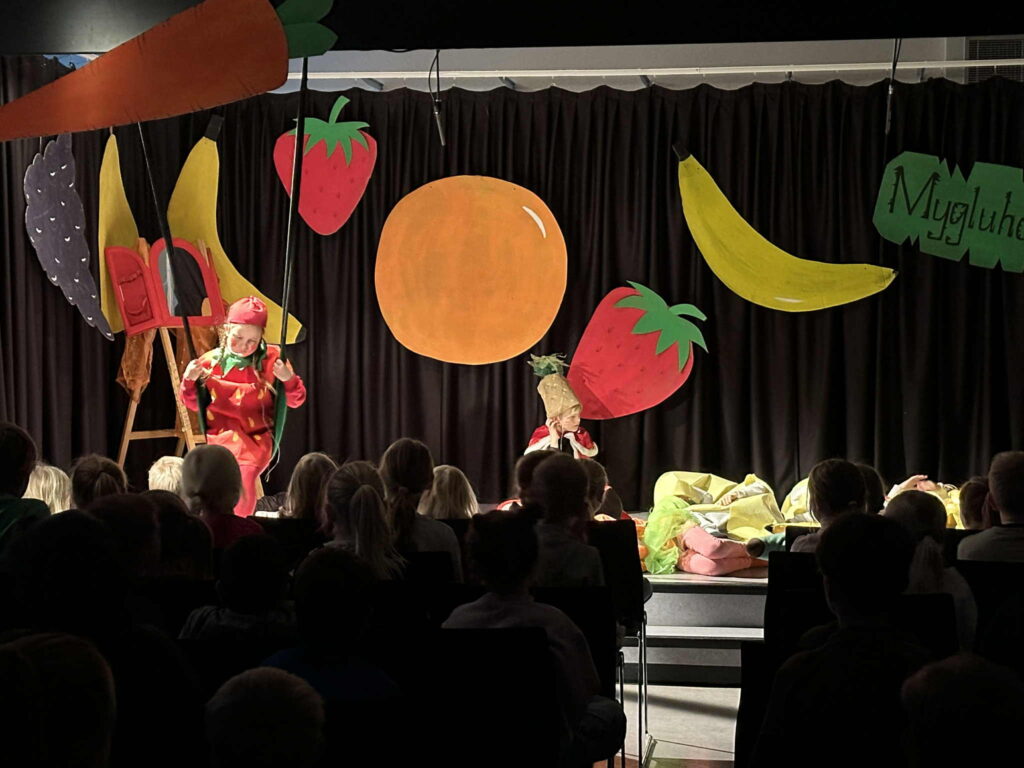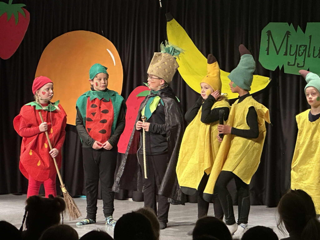 Nemendur í 4. bekk sýndu í vikunni söngleikinn Ávaxtakörfuna, sem fjallar um einelti og fordóma. Leikritið gerist í ávaxtakörfu þar sem allir ávextirnir eru kúgaðir af Imma ananas. Nemendur settu verkið upp með miklum metnaði og glæsibrag, og einkenndist sýningin af gleði og litadýrð.