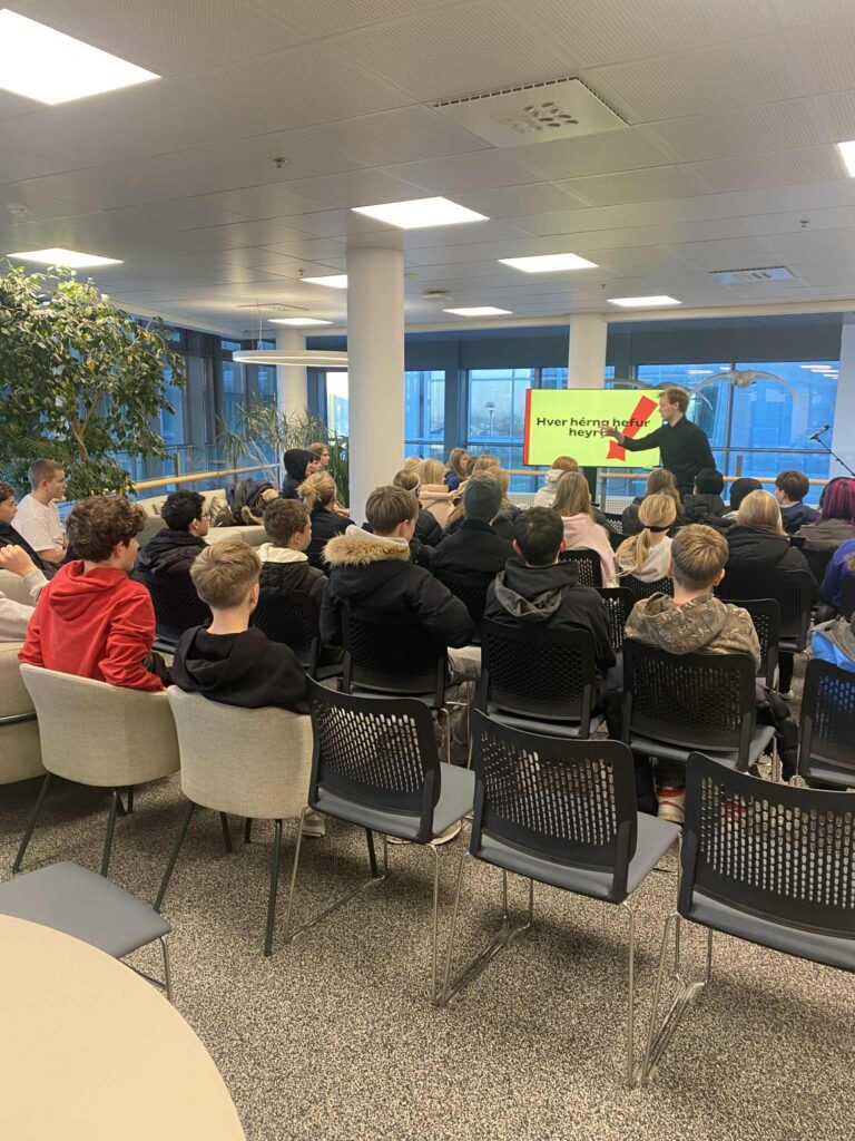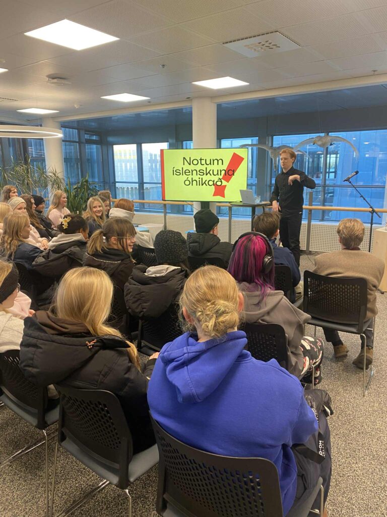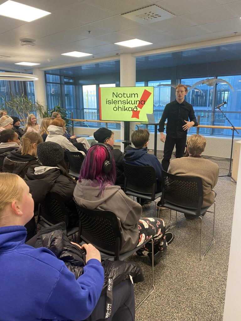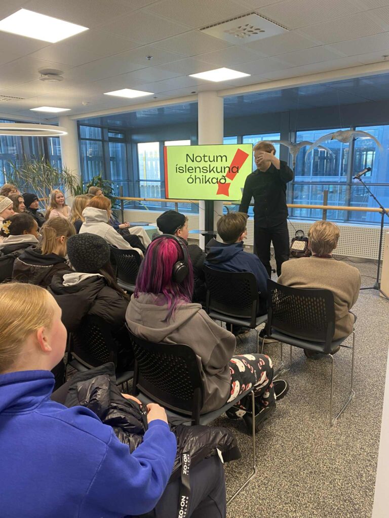 Króli deildi með nemendum eigin reynslu af textagerð og sköpun, ræddi gildi þess að rækta tungumálið og hvatti þau til að nýta íslenskuna á fjölbreyttan og skapandi hátt, hvort sem er í tónlist, ritun eða öðrum listgreinum. Nemendur hlustuðu af áhuga og fengu tækifæri til að spyrja spurninga og ræða efnið nánar.