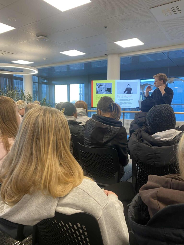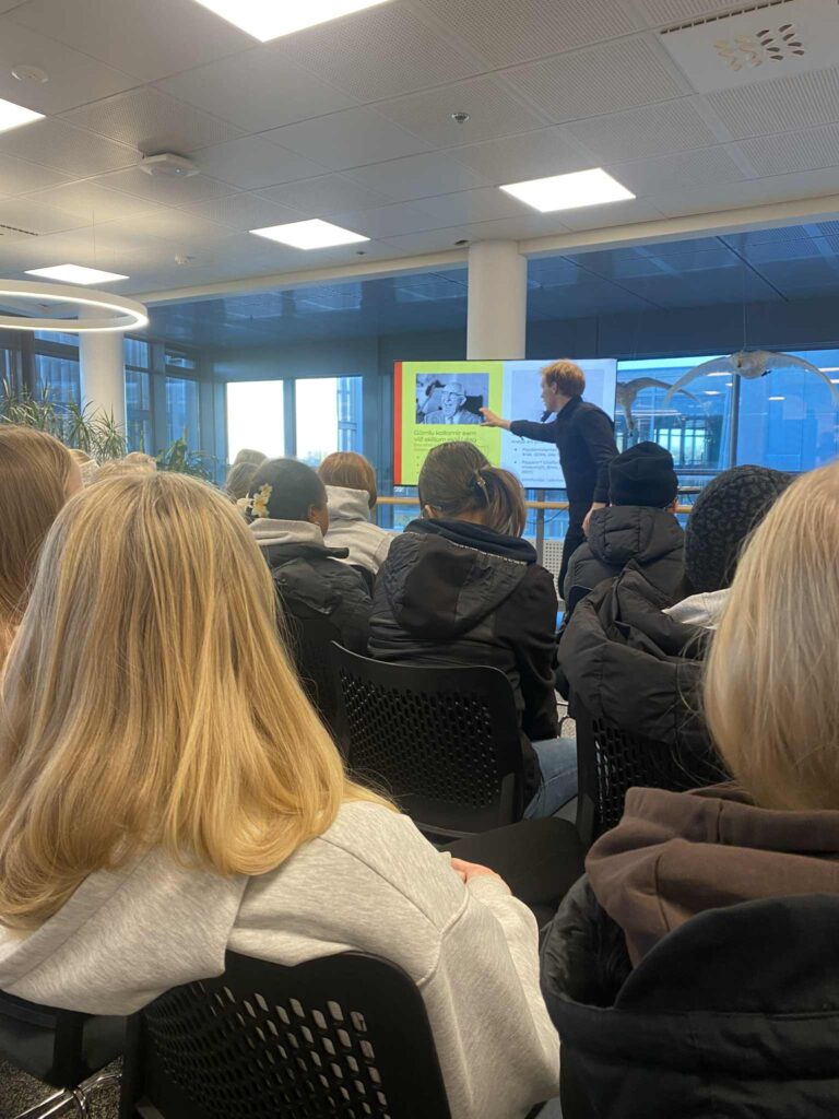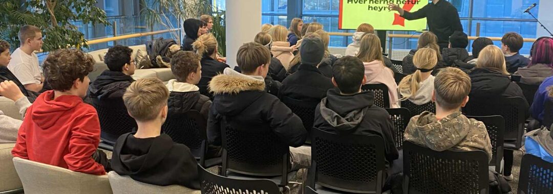 Á þriðjudaginn fóru nemendur í 9. bekk, ásamt umsjónarkennurum sínum, Berglindi Pálu Bragadóttur og Guðrúnu Halldórsdóttur, í fróðlega og skemmtilega heimsókn á Bókasafn Kópavogs. Þar tóku þau þátt í lifandi og áhugaverðum fyrirlestur frá tónlistarmanninum Króla, sem fjallaði um mikilvægi þess að skrifa, skapa og tjá sig á íslensku.