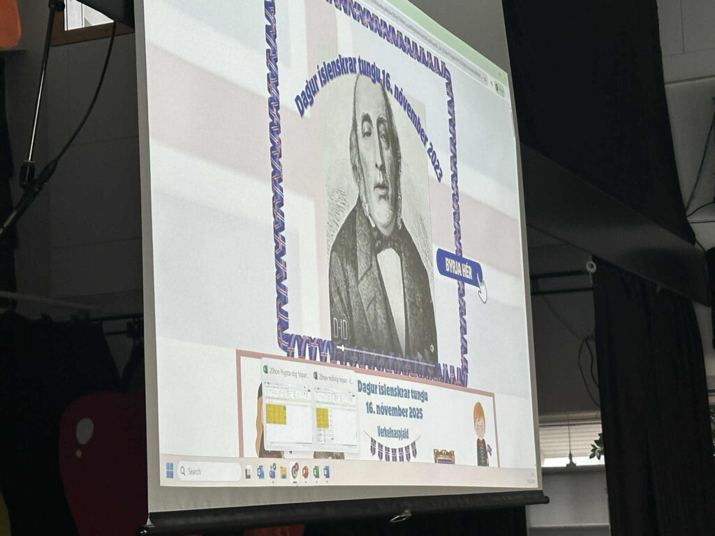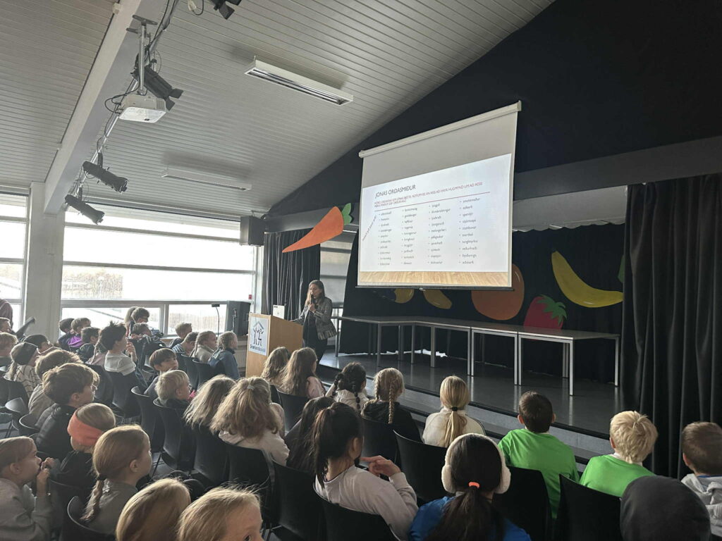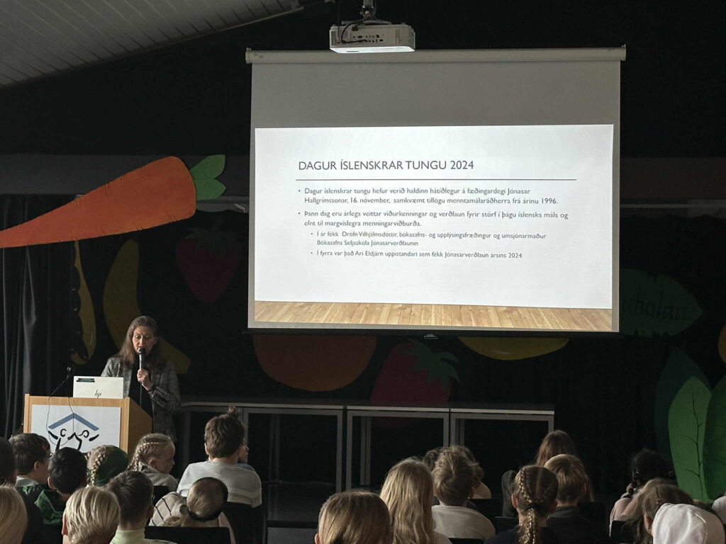 Að sama tilefni hélt Kristín Pétursdóttir deildarstjóri fræðandi og lifandi kynningu um Jónas Hallgrímsson, skáld dagsins, og mikilvægi íslenskrar tungu. Kristín kynnti jafnframt upplestrarkeppni 7. bekkjar, sem nú hefst formlega og mun standa fram í mars.