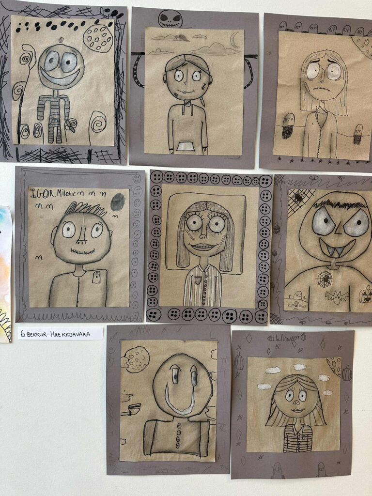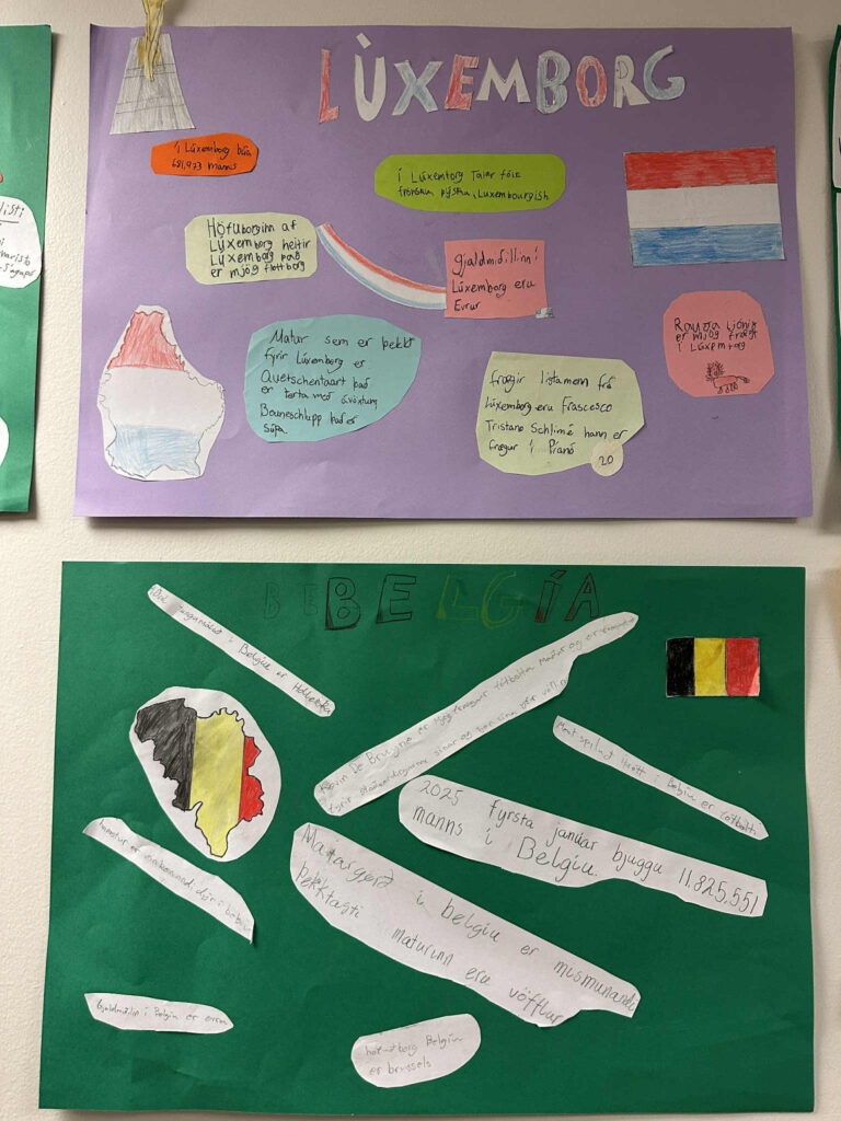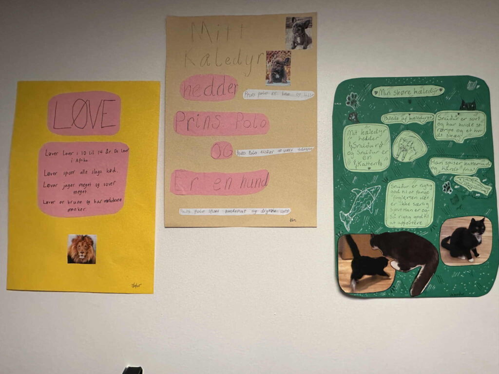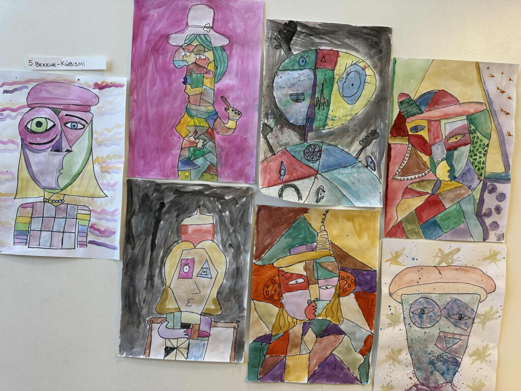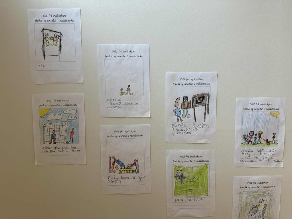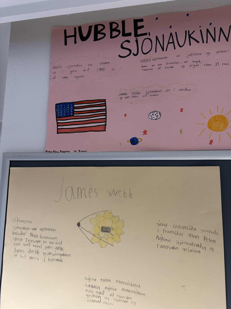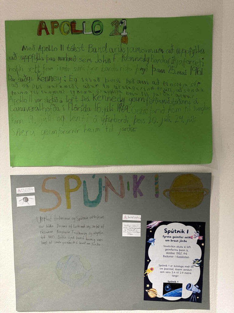 Á veggjum skólans má sjá teikningar og ýmis listaverk sem nemendur hafa búið til og upplýsingar til nemanda
