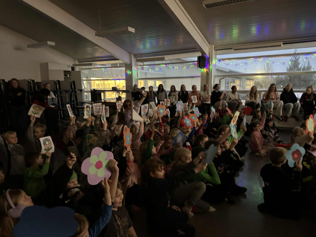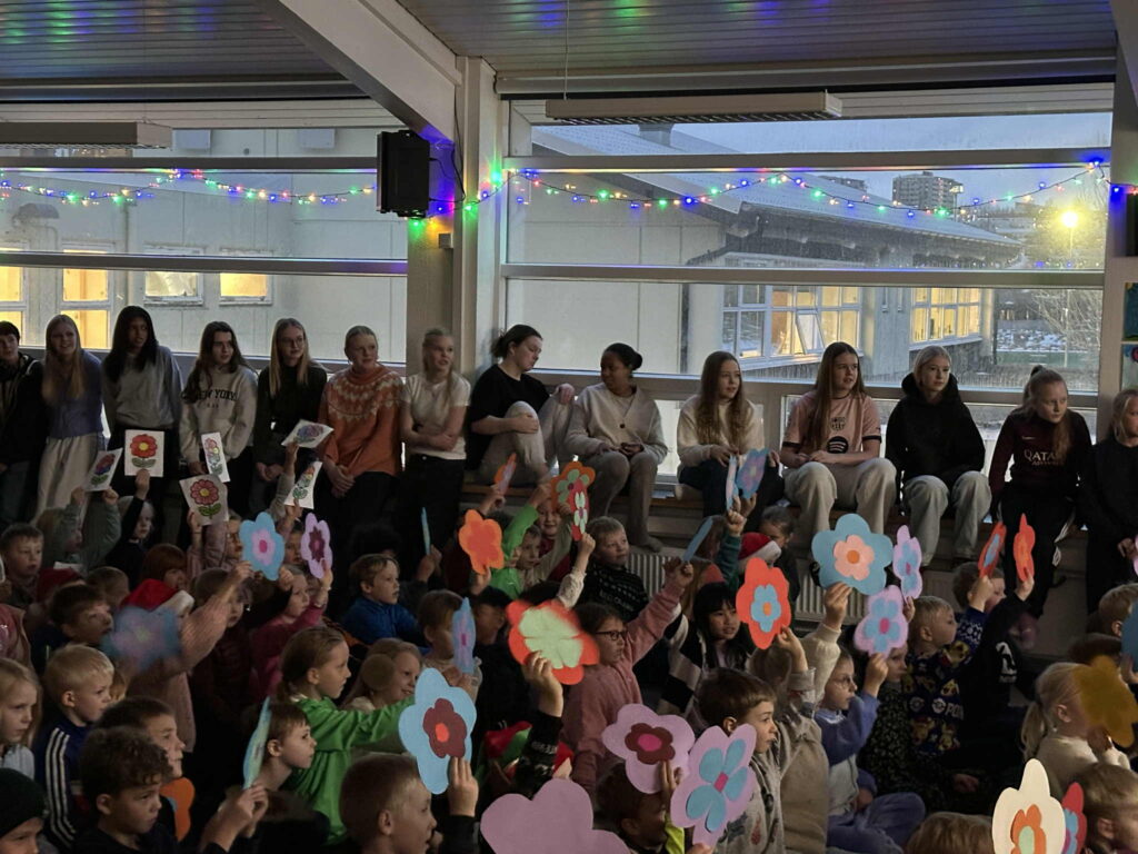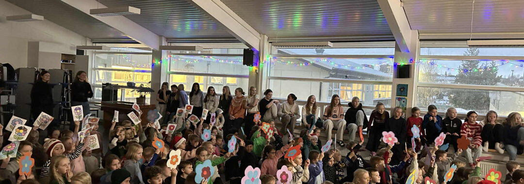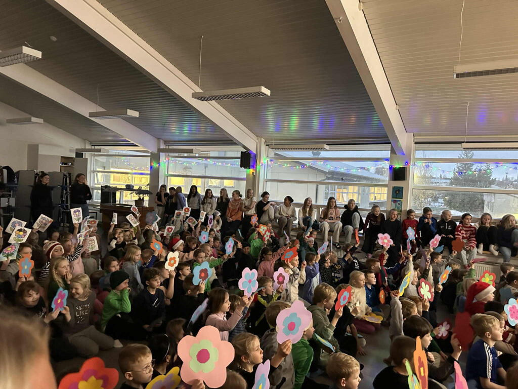 Nemendur Snælandsskóla sem höfðu áhuga komu saman og sungu lagið, en yngsta stig skólans hafði einnig myndskreytt blóm og gerðu stemninguna enn hátíðlegra.