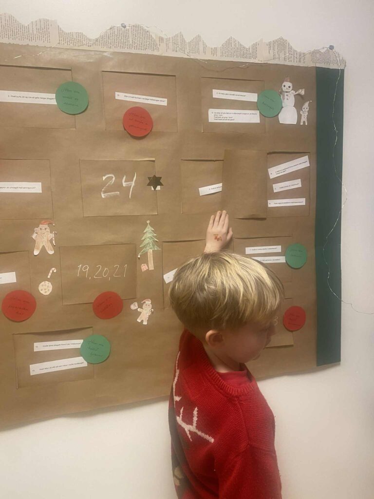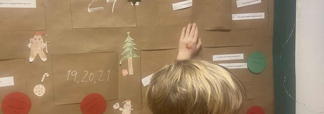 Á yngsta stigi eru nemendur að hlusta á söguna Rauð viðvörun – Jólin eru á leiðinni. Á hverjum degi fara nemendur upp á bókasafn til Guðmundu þar sem þau fá spurningu úr sögunni í jóladagatali skólans sem var staðsett er á vegg bókasafnsins.