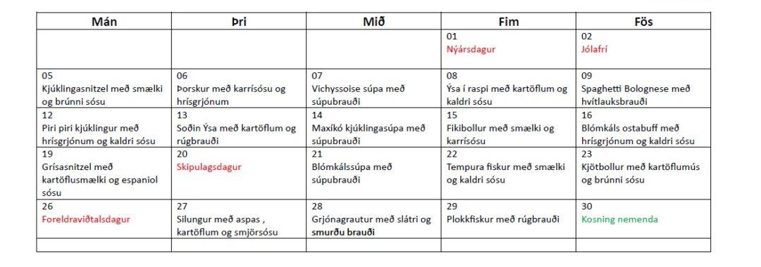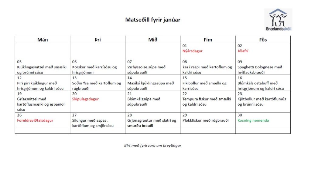 Matseðill í janúar Posted on 5. janúar, 20266. janúar, 2026 Grænmetis- og ávaxtabar með öllum máltíðum Matseðillinn getur breyst án fyrirvara. Posted in Fréttaflokkur.